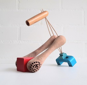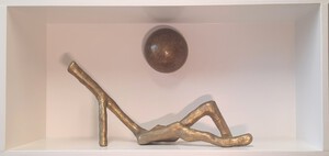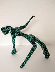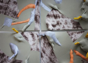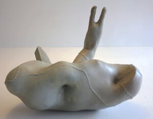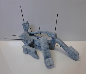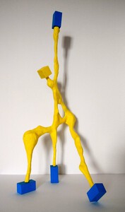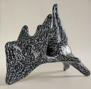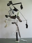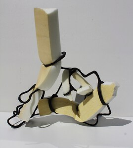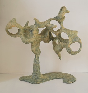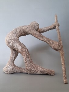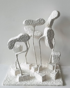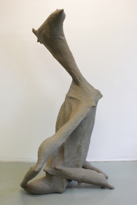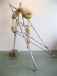 Bij mijn recente werk maak ik een constructie, meestal van natuurlijke materialen zoals hout, karton, bamboe enz. Met papiermache of klei werk ik de vorm vervolgens verder uit.