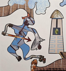 "Krijger" collage op board h77xb47cm. 2023